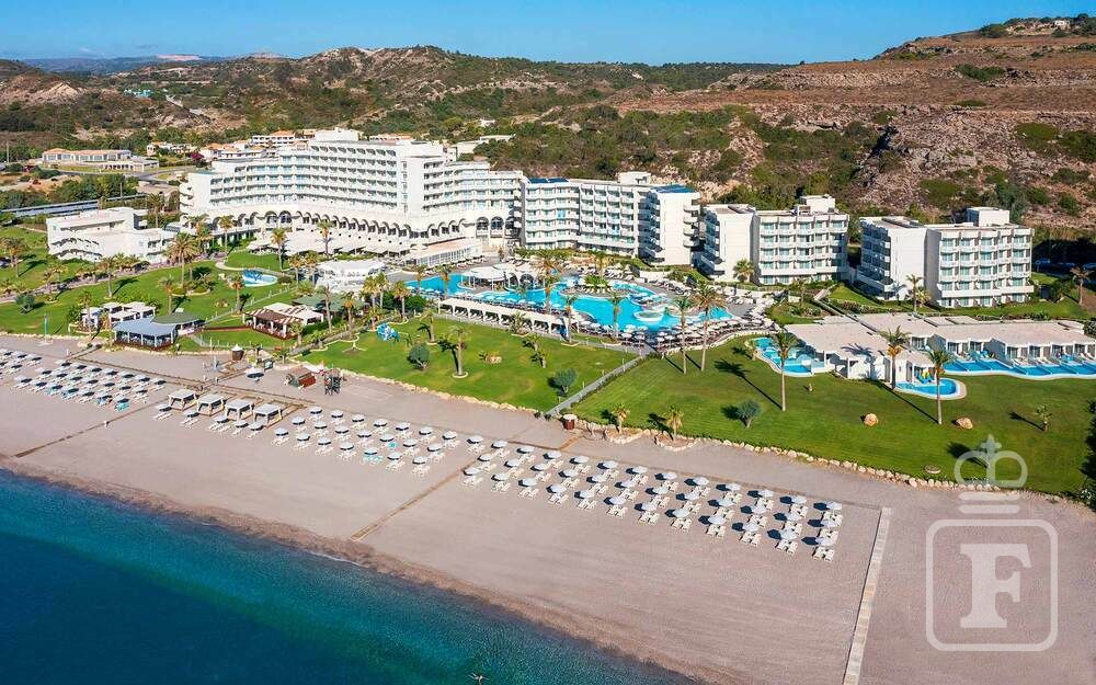 Veľkoryso riešený a starostlivo udržiavaný hotelový komplex Rodos Palladium Leisure & Wellness so záhradou a sústavou bazénov sa nachádza priamo pri pláži, v pokojnej časti strediska Faliraki. Hotelové izby nedávno prešli rekonštrukciou.