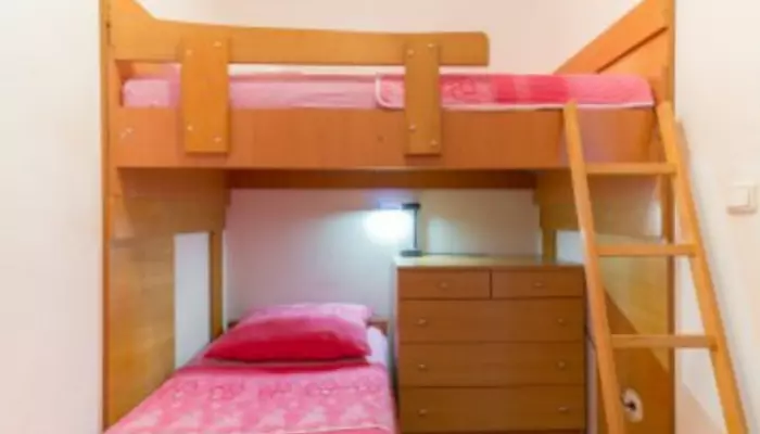 - APT 1/4(+1) - prízemie: dve 2-lôžkové spálne, jedna s manželskou posteľou, druhá s poschodovou posteľou, denná miestnosť s kuchynským kútom a chladničkou, rozkladacia pohovka pre 1 dospelú osobu alebo 2 deti
