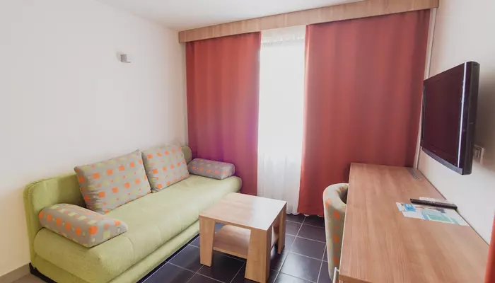 - APT 1/6+2 – dve 2-lôžkové spálne s manželským lôžkom, jedna spálňa s rozkladacou pohovkou pre dve osoby, denná miestnosť s rozkladacou pohovkou pre dve deti do 12 rokov, kuchynský a jedálenský kút, terasa alebo balkón s posedením