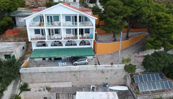 - 2x APT 1/4+1 - podkrovie: dva luxusne vybavené apartmány majú dve 2-lôžkové spálne (jedna spálňa s vlastnou kúpeľňou a balkónom), priestranná obývacia miestnosť s rozkladacou pohovkou pre 1 osobu, elektricky ovládané žalúzie, druhá kúpeľňa, práčka, kuchynský a jedálenský kút, rúra na pečenie, balkón s čelným výhľadom na more