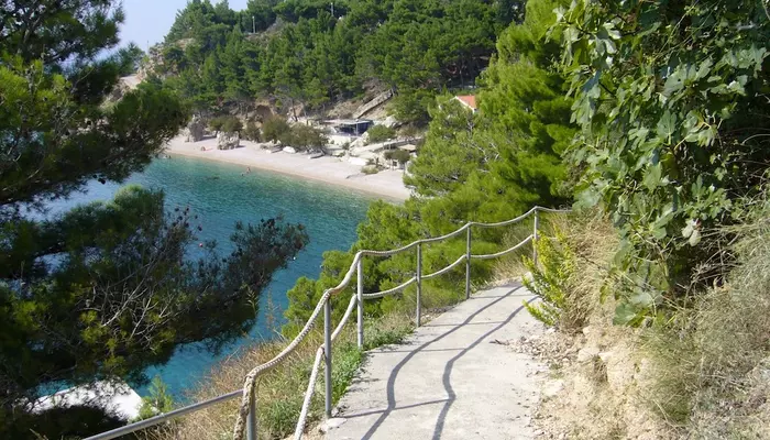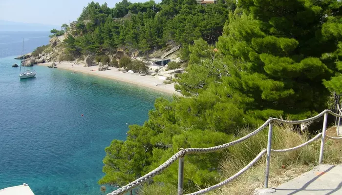 - cesta na pláž vedie po schodoch a cestičke v tieni borovíc