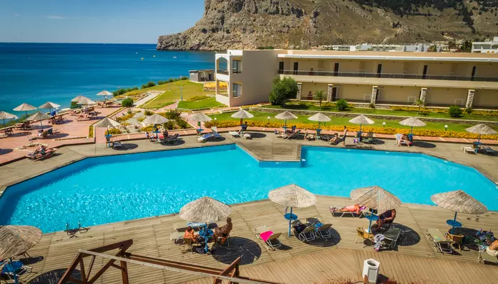 Príjemný hotelový komplex Lutania Beach je umiestnený priamo pri pláži v letovisku Kolymbia, ktoré poskytuje priestor na večerné prechádzky a na nákup suvenírov. Priamo z bazéna je nádherný výhľad na more.