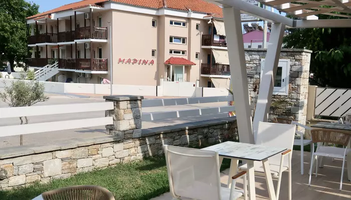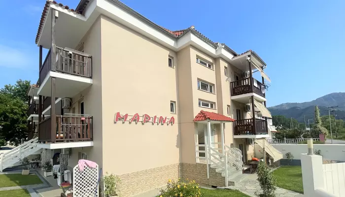 Malý apartmánový komplex Porto Marina sa nachádza v letovisku Skala Panagia, v blízkosti pláže Chrissi Ammoudia (Zlatá pláž), s bielym pieskom. Pozostáva z dvoch budov, pričom pred jednou z nich je k dispozícii menší bazén. Celý záliv patrí k najkrajším miestam na ostrove Thassos.
